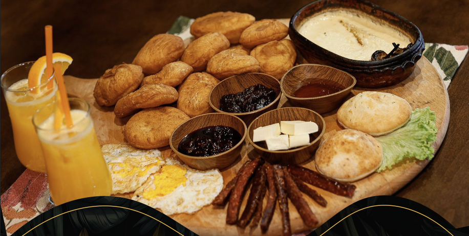 (Omlet , 2 krepa, suxhuk shtëpie, përshutë viçi, djathë, Tranguj, domate, 1 gotë qumësht, espresso)