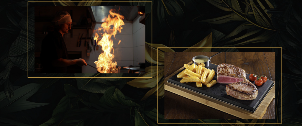 (Ramstek, mish i thatë i tymosur kërpudha te freskta,krem pana, balsamico)