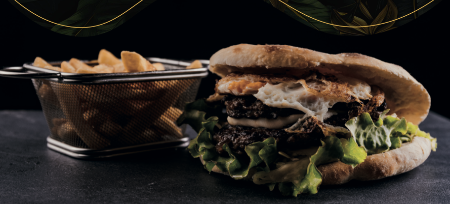 (Qofte viçi, tranguj, domate, sallatë, djath shtëpie, vezë, salcë hamburgeri, pomfrit)